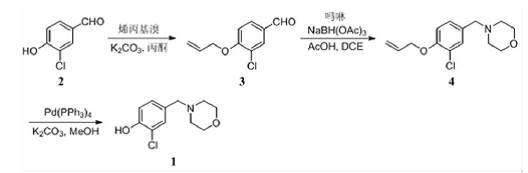 As a heterocyclic structural fragment, morpholine can better adjust the water solubility of the molecule and improve the lipid-water partition coefficient (LogP) of the molecule. Therefore, it is widely incorporated into marketed drugs (such as the antibacterial drug Linel azodone, the antidepressant moclobemide, etc.) and active small molecules. Among the many functionalized structural fragments containing morpholine rings, 4-benzylmorpholine and its analogs have attracted a lot of research interest. Some studies have explored a new synthetic route to prepare the key intermediate 2-chloro-4-(morpholinylmethyl)phenol (1) of this compound. That is, using 3-chloro-4-hydroxybenzaldehyde (2) as raw material, first use allyl bromide to protect the phenolic hydroxyl group to obtain 4-(allyloxy)-3-chlorobenzaldehyde (3), and then use NaBH(OAc )3 reacts with morpholine through reductive amination to prepare 4-(4-(allyloxy)-3-chlorobenzyl)morpholine (4), and finally uses the Pd(PPh3)4/K2CO3 system to remove the alkene The target compound (1) was synthesized using propyl protecting group.