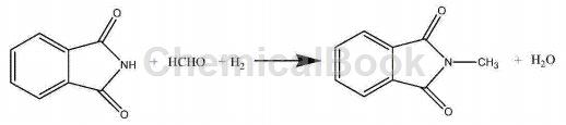 Using phthalimide as the starting material, it reacts with formaldehyde in an aqueous solution to form a transition state quaternary ammonium base, and then reacts with hydrogen to form N-methyl phthalimide. The reaction equation is shown in the figure below. The specific steps are: add 200g (1.36mo1) phthalimide, 160g (1.97mol) industrial formaldehyde aqueous solution with a mass fraction of 37% and 200g deionized water into a 1L stainless steel magnetic stirring autoclave. Use 10% hydrochloric acid to adjust the pH to 5.5, seal the reaction kettle, replace the air in the kettle with nitrogen and start stirring to raise the temperature. When the temperature rises to 80°C, the gauge pressure is 0.015MPa. At this time, introduce hydrogen gas and ensure that the temperature in the kettle is between 80-85°C. After 45 minutes, the pressure in the kettle began to rise. Close the hydrogen gas inlet valve, and the gauge pressure in the kettle is 0.05MPa. Continue to keep warm and stir for 20 minutes. Cool the temperature to 40 degrees. After replacing the gas in the kettle with nitrogen, pour out the solid-liquid mixed reaction solution. The reaction solution was filtered with a Buchner funnel, and the filter cake was washed with 50 ml of water and dried to obtain 215 g of white fine needle-shaped crystalline powder, which is the product phthalimide.