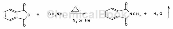 Using phthalic anhydride as the starting material, react with methylamine under heating conditions to prepare N-methylphthalimide. The reaction equation is shown in the figure below. The specific process flow is: put phthalic anhydride into the reaction vessel, and control the temperature under the protection of inert gas.130℃-300℃, stir and introduce methylamine gas, react for 1-4 hours, add the reaction mixture into the water-soluble solvent, precipitate white crystals, filter and dry to obtain the finished product.
