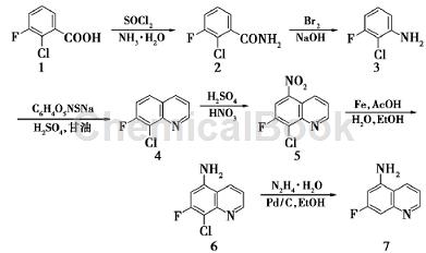 2. Preparation of 5-amino-7-fluoroquinoline. Quinoline compounds are a very important class of compounds among nitrogen heterocyclic alkaloids, with significant physiological activity and broad application prospects. The latest research shows that small molecules with aminoquinoline structures can serve as brain-penetrating selective JNK inhibitors, and the aminoquinoline structure can improve the pharmacokinetic properties of drugs used to prevent neurodegenerative diseases. In addition, this type of compound can also serve as a sub-trace inhibitor of the new NAD-hydrolase CD38, effectively improving geriatric diseases and obesity. Because of the potential effects of aminoquinoline compounds, medicinal chemists have conducted extensive research on their medicinal properties, and usually introduce fluorine atoms to improve their medicinal properties. Among them, 5-amino-7-fluoroquinoline is an important compound among this type of fluorine-containing aminoquinoline compounds. However, there are currently few reports on the synthesis of this compound and the yield is low. In some experiments, simple and easily available 2-chloro-3-fluorobenzoic acid was used as the starting material, and the title compound was obtained through a 6-step reaction of substitution, Hofmann degradation, ring closure, nitration, iron powder reduction, and hydrogenation and dechlorination of 8-chloride. . This process route has low cost, easy operation, and a total yield of up to 43%, making it suitable for industrial production.