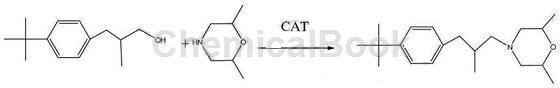 Method 3: Using tert-butylbenzene as the raw material, first undergo acylation to obtain 4 tert-butylpropiophenone through F-C reaction, and then perform Vilsmeier reaction with phosphorus oxychloride and alkali in dimethylformamide More than 95% of 4-tert-butylphenyl-1-chloro-2 methacrolein is obtained. The enal is hydrogenated and reduced to 4-tert-butylphenylisobutyraldehyde via Pd/C, and the saturated aldehyde is then mixed with 2 , 6-dimethylmorpholine reaction can produce fenpropimorph. The reaction equation is as follows: