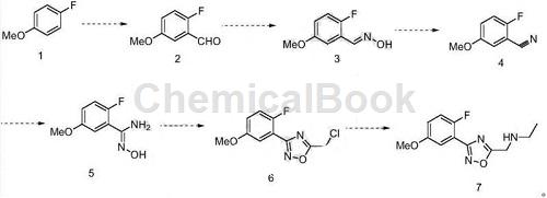 N-((3-(2-Fluoro-5-methoxyphenyl)-1,2,4-oxadiazol-5-yl)methyl)ethylamine and related derivatives in medicinal chemistry and has wide applications in organic synthesis. At present, the synthesis of N-((3-(2-fluoro-5-methoxyphenyl)-1,2,4-oxadiazol-5-yl)methyl)ethylamine is relatively difficult. Therefore, it is necessary to develop a synthesis method with easily available raw materials, convenient operation, easy control of the reaction, and suitable overall yield. Research has developed a fluorine-containing benzene-substituted oxadiazole compound N-((3-(2-fluoro-5-methoxyphenyl)-1,2, 4-oxadiazole-5-yl)methyl ) The preparation method of ethylamine uses 4-fluoroanisole as the starting material, and obtains the target product through aldehyde, oximation, elimination, addition, ring closure, and substitution reactions.