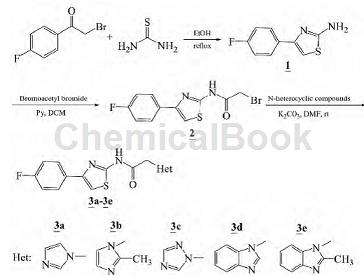 2. Synthesis of nitrogen heterocyclic substituted aminothiazole derivatives. Thiazole rings are an important class of five-membered aromatic heterocycles containing nitrogen and sulfur heteroatoms. They have wide potential application value in many fields such as chemistry, pharmacy, biology, and materials science, and have attracted great attention from many workers [1- 3. Heterocyclic compounds generally have good pharmacological activities, especially nitrogen heterocyclic compounds, which are widely used in the fields of drug synthesis and drug design. By synthesizing compounds, compounds with better pharmacological activity can be obtained. Using 2-bromo-4′-fluoroacetophenone and thiourea as raw materials, 2-amino-4-(4-fluorophenyl)thiazole (1) is obtained through condensation reaction, and then reacts with bromoacetyl bromide to form bromoamide Intermediate (2) was then reacted with imidazole, triazole and benzimidazole respectively to synthesize 5 new N-heterocyclic substituted aminothiazole compounds (3a~3e):