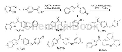 3. Synthesis of new phenyl ether benzofuran derivatives. Furan compounds are widely present in a variety of medicinal plants and have attracted much attention due to their various physiological activities, such as anti-tumor, antibacterial, antifungal, antioxidant, etc. At present, a large number of studies have been conducted on the derivatization of benzofuran compounds at home and abroad, which has enriched people’s understanding of this type of compounds. Phenolic compounds have good bactericidal and antioxidant activities. By connecting phenol and benzofuran, compounds with novel structures and further research value are obtained. Starting from salicylaldehyde and 2-bromo-4′-fluoroacetophenone as raw materials, 2-(4-fluorobenzoyl) benzofuran is generated through substitution and cyclization reactions, and then reacted with phenolic compounds to synthesize 6 new phenyl ether benzofuran derivatives (2a ~ 2f):