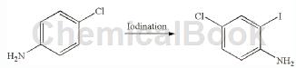 2-Iodo-4-chloroaniline is prepared as follows: add an aqueous solution of potassium iodide (50g, 0.301mol), iodine (76g, 0.299mol) and water (100mL) over 45 minutes. Stir 4-chloroaniline (35 g, 0.276 mol, 50 μm average particle size), sodium bicarbonate (37 g, 0.440 mol) and water (210 mL) under stirring. The mixture was stirred for 3-5 hours. The solid was collected by filtration, washed with water, and dried to give 2-iodo-4-chloroaniline (69.6 g, 100% yield, 98.5% purity). 1H NMR (CDCl3): δ7.56 (d, 1H, J = 2.4Hz), 7.12 (dd, 1H, J = 2.4Hz, 8.6Hz), 6.75 (d, 1H, J = 8.6Hz), 5.37 (br s, 2H).