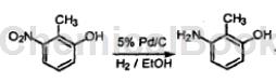 Dissolve 2-methyl-3-nitrophenol (25g, 0.163mol) in 170ml of absolute ethanol in a hydrogenation flask. Purge the flask with nitrogen. 10% palladium on carbon (1.73g, 1.6mmol) was added and the mixture was hydrogenated (40psi (2758hPa) H2) in the apparatus for 1.5 hours. The flask was evacuated and purged with nitrogen. Whatman GF/F filters remove catalyst by filtration. After removal of ethanol under reduced pressure, 20.1 g (100% yield) of 2-methyl-3-aminophenol were obtained as a light brown solid.