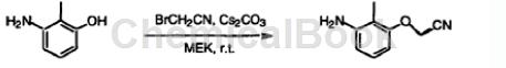 Step 1: Dissolve 2-methyl-3-aminophenol (20.1g, 0.163mol) in methyl ethyl ketone (MEK) (150ml). Cesium carbonate (106g, 0.326mmol) was added in portions, followed by bromoacetonitrile (29.3g, 0.245mol) dropwise over 30 minutes. The mixture was stirred at room temperature for 14 hours and then filtered through a coarse fritted funnel. The solid was washed with ethyl acetate (2 × 100 ml), and the combined washings and filtrate were concentrated under reduced pressure to obtain 20.8 g (79% yield) (2-methyl-3-aminophenoxy)acetonitrile without further purification. .